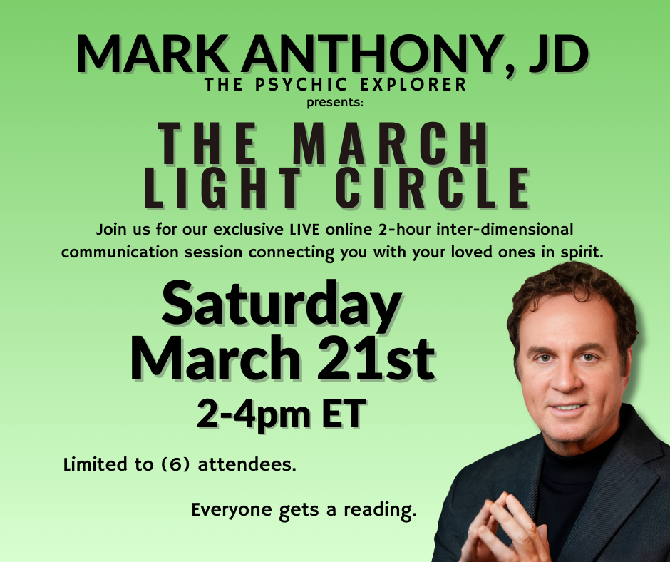 MARK ANTHONY, JD, PSYCHIC EXPLORER (aka The PSYCHIC LAWYER®) is the author of the best-sellers THE AFTERLIFE FREQUENCY, EVIDENCE OF ETERNITY and NEVER LETTING GO.